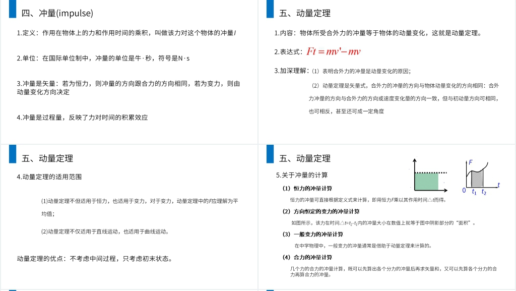 4. 动量定理:我们引入了动量定理的概念,并详细讲解了动量定理的表达式及其推导过程。通过实例分析和数学推理,帮助学生理解动量定理的原理和应用条件,并学会运用动量定理解决实际问题。