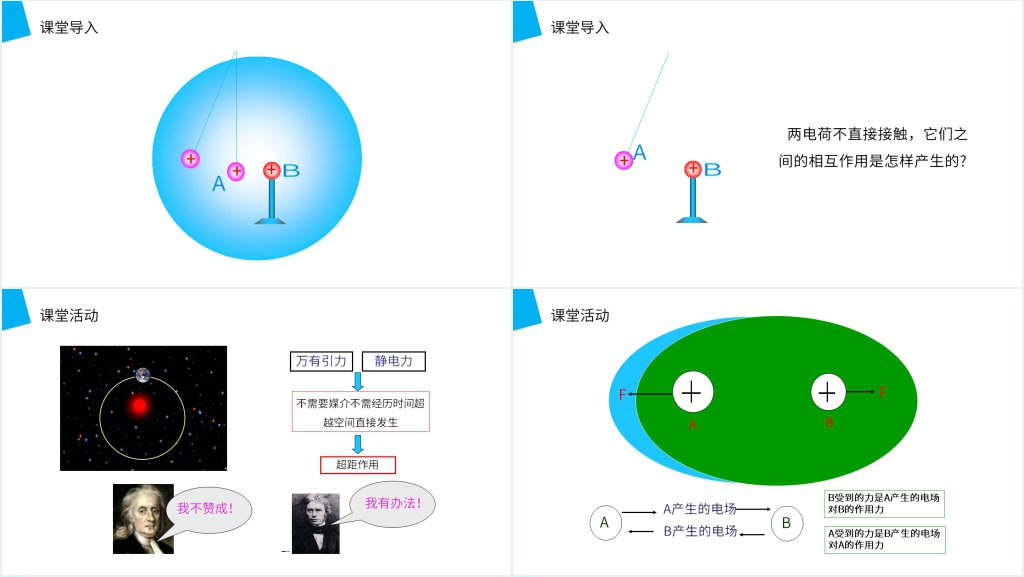 1. 导入活动:我们通过一个生活中的例子或实验现象,如静电引力的观察和实验演示,引发学生对电场的思考,并激发他们对电场的兴趣。