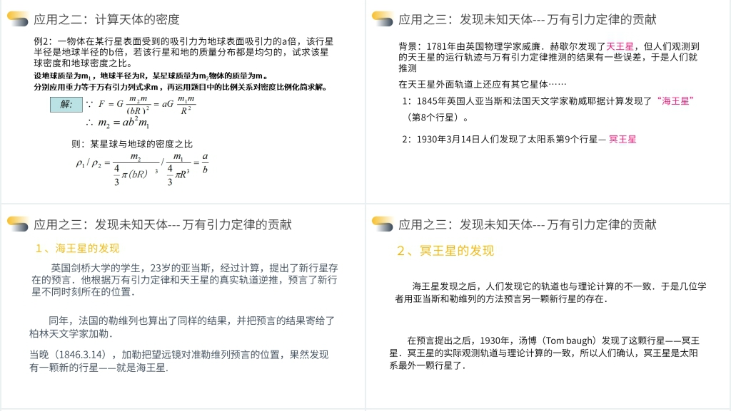 3. 讨论和练习:我们组织讨论,并提供一些例题和练习题,引导学生运用万有引力定律解决不同类型的问题。通过讨论和练习,学生可以掌握如何应用万有引力定律解决实际问题,并培养逻辑思维和问题解决能力。