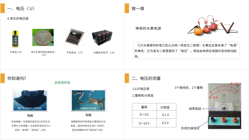3. 实验和观察:我们组织学生进行实验活动,如使用电压表测量不同电路的电压,并改变电池数量和连接方式进行观察。通过实际操作和观察结果,学生能够加深对电压测量的理解,并培养实验设计和数据处理的能力。