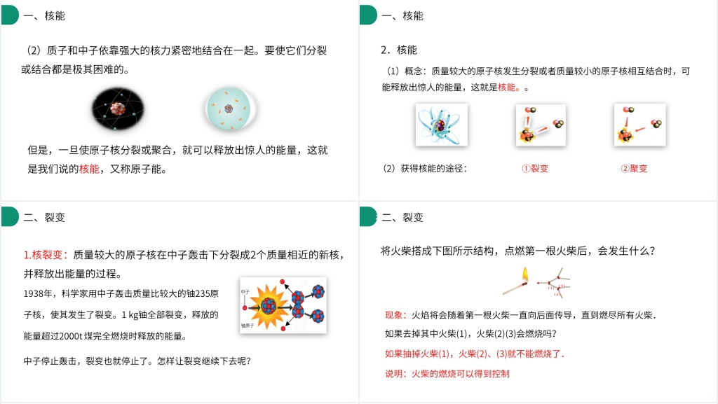 1. 导入活动:我们通过展示一些与核能有关的实际问题,如核能在核电站中的应用、核武器的威力等,引发学生对核能的思考和兴趣。这些问题激发了学生的主动学习热情。