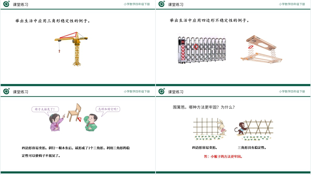 这套小学数学四年级下册《三角形的稳定性》教学PPT课件属于内容型,已包含实质内容,可直接使用!
