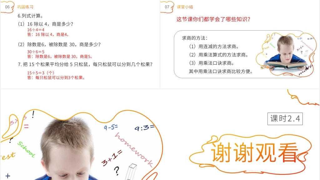 5. 总结与小结:在课堂结束时,我们对本节课的重点内容进行了总结。通过提问和互动,让学生回顾所学知识,梳理使用乘法口诀求商的步骤,并解答他们的问题和疑惑,加深他们的理解。