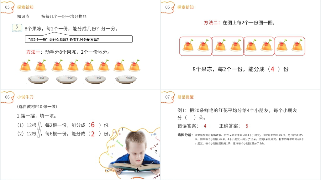 2. 平均分的概念介绍:我们通过实例引导学生理解平均分的概念。比如我们可以给学生举几个小组分糖果的例子,让他们观察并思考如何将糖果平均分给每个人。