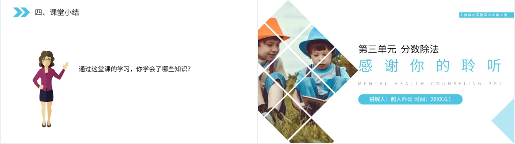 我代表小学六年级上册数学教学团队,向大家汇报本节课《一个数除以分数》的课文教学总结。