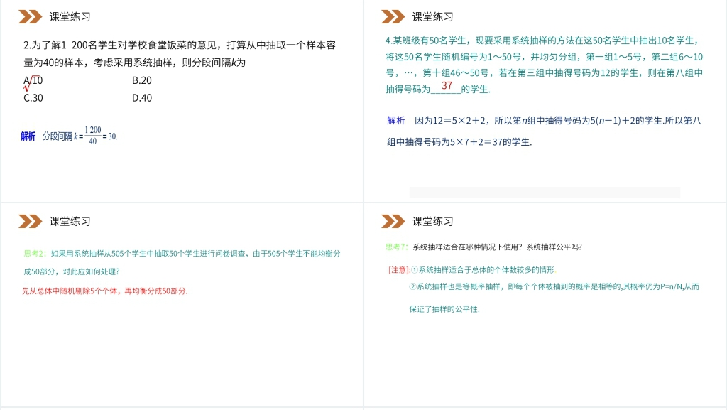 系统抽样的关键是确定合适的抽样间隔k和起始元素a,以保证样本能够代表总体。一般来说,k应该尽可能小,以增加样本的多样性;a应该尽可能随机,以避免系统误差。此外,还要注意总体是否有周期性或趋势性,如果有,要避免与抽样间隔相同或成倍数关系,否则会导致样本失效。