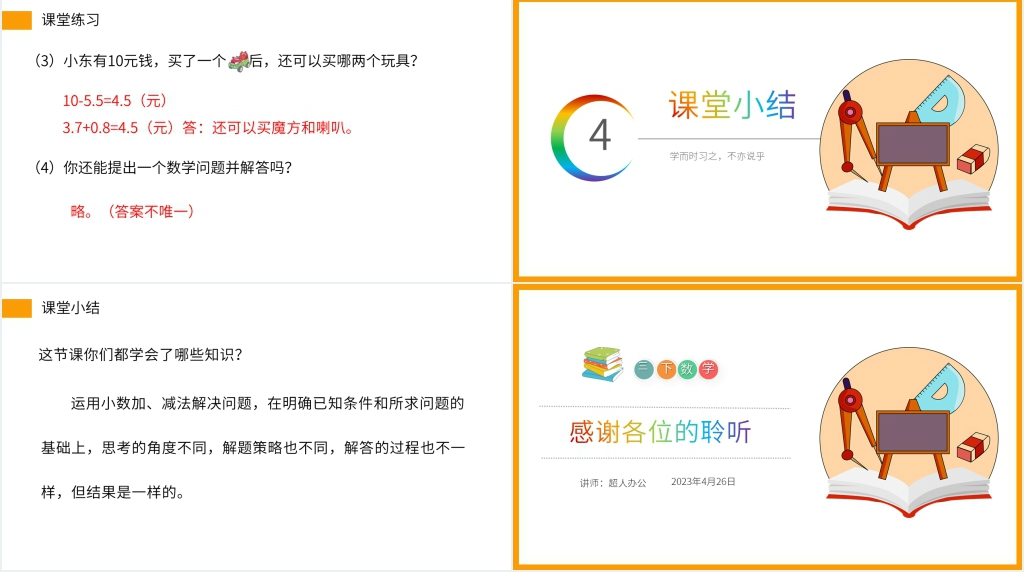这套小学数学三年级下册《利用简单的小数加、减法解决问题》PPT课件属于内容型,已包含实质内容,可直接使用!