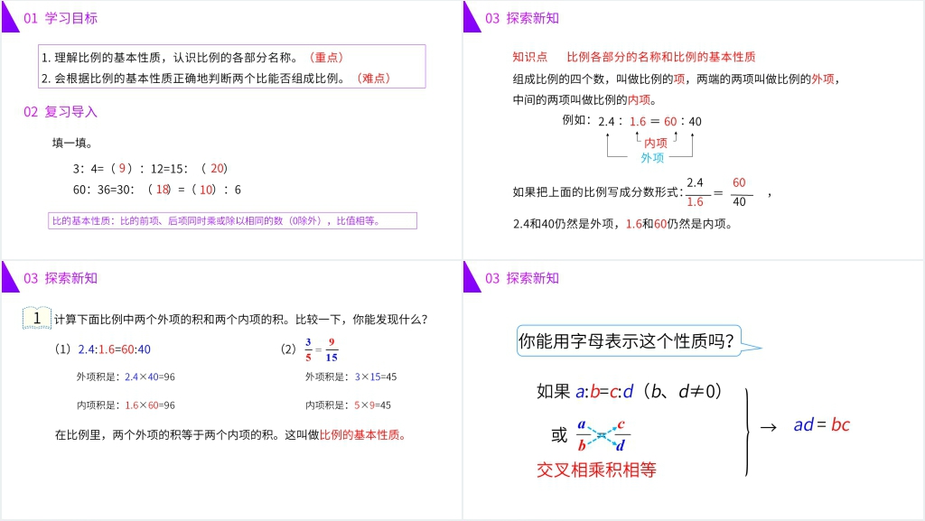通过回顾前面学过的比例的概念和判断比例的方法,引出比例的基本性质。例如,给出一个比例4:6=8:12,让学生判断是否成立,并说明理由。然后,提问:如果把这个比例的两边交换位置,或者把两边分成两组,还是不是比例?为什么?