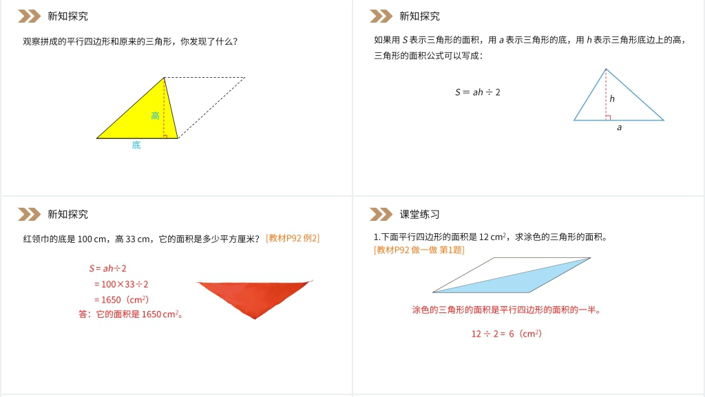 - 通过实验活动,让学生用剪纸法将三角形变成平行四边形或矩形,发现三角形的面积等于它的底与高的乘积的一半。