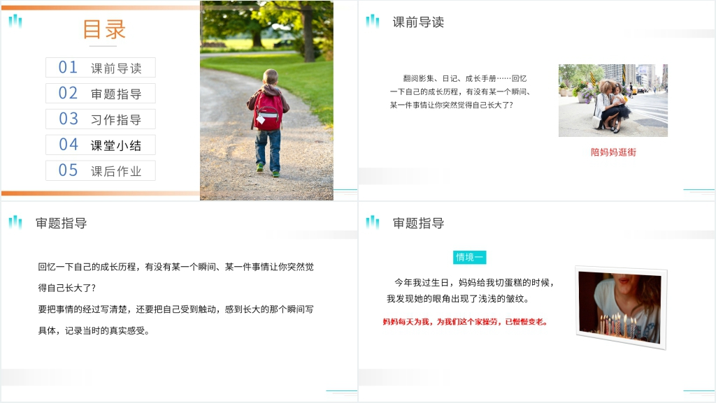 1. 导入情境:为了激发学生的兴趣,我们通过提问和分享,引导学生回忆和讨论自己在日常生活中的成长经历,激发学生对成长话题的思考和关注。