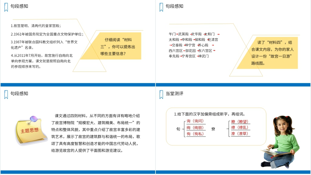 1. 文化遗产学习:我们引导学生通过课文了解故宫博物院的历史和建筑特点,了解其中陈列的文物和艺术品。通过图片、视频等多媒体资源,让学生更加直观地了解故宫的壮丽和文化价值。