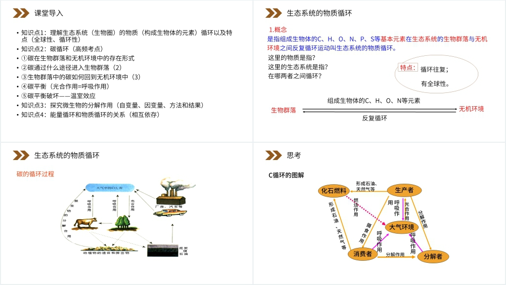 1. 通过多媒体展示一段视频,介绍地球上各种生态系统的美丽景色,引导学生思考生态系统中有哪些物质参与了能量流动和物质循环。