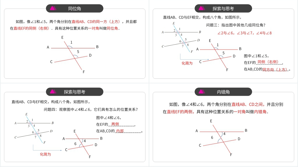 2. 学习同位角内错角和同旁内角的相关性质:我们通过教师讲解和学生参与讨论,引导学生发现和总结同位角内错角和同旁内角之间的特点和关系。我们鼓励学生进行自主思考和发现,提升他们的数学思维和推理能力。