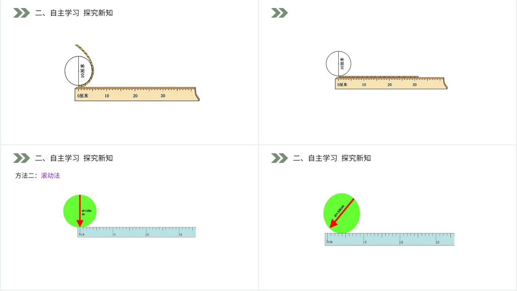 3. 演示计算圆的周长:我们设计了一系列计算圆的周长的练习题,包括直径已知和半径已知的情况。通过具体计算步骤和示范,帮助学生掌握使用公式计算圆的周长的方法。