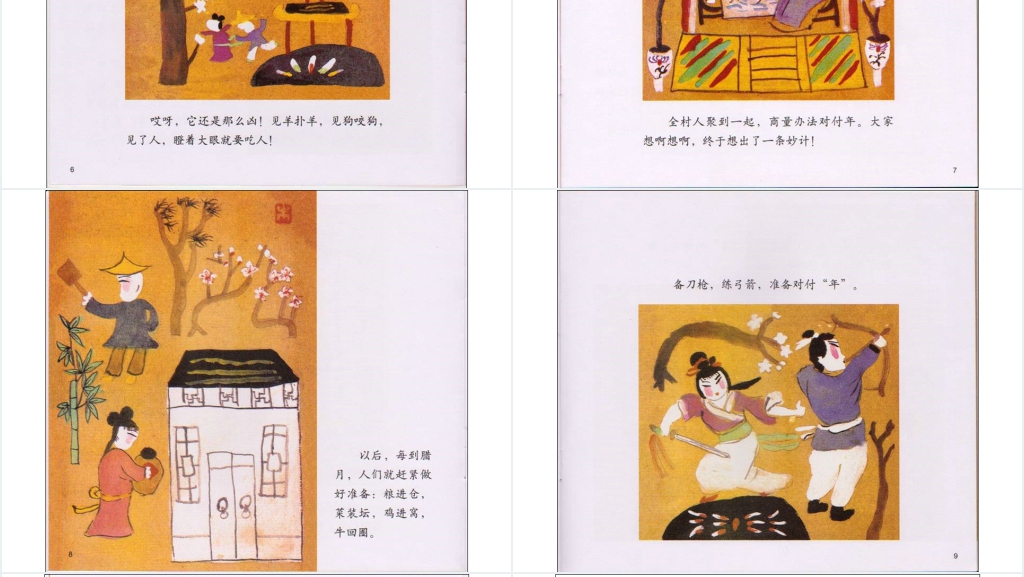 《年兽》是一个关于怪兽袭击村庄,被村民用红色、火光和鞭炮驱赶的故事。这个故事说明了春节为什么要贴红对联、放鞭炮和挂灯笼,也表达了人们对新年的祝福和希望。