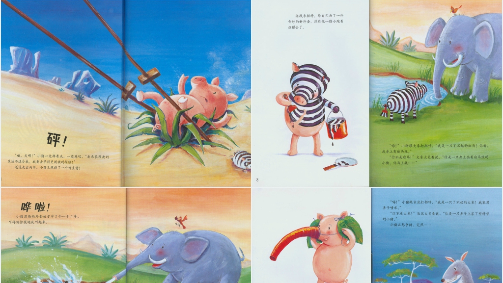 这是一个关于小猪变形记的语言活动,旨在通过绘本的方式,提高学生的阅读理解能力和创造性表达能力。绘本的内容是这样的: