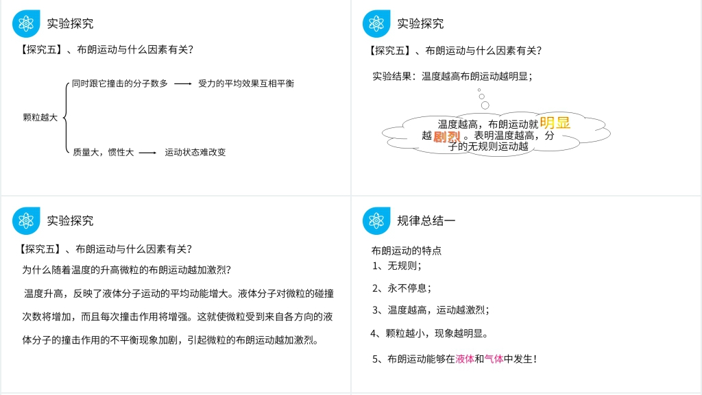 最后,我们进行了一些小组讨论和展示,鼓励学生们分享自己对分子热运动的理解和应用。通过学生之间的交流和互动,促进学生们思考和合作,拓宽了他们对分子运动的认识和思考深度。