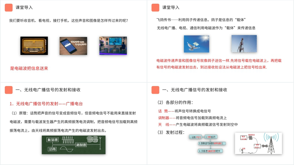 本课的教学重点是广播电视和移动通信的基本原理,难点是电磁波的调制和解调。本课的教学方法是以问题为导向,通过实验、演示、讨论等方式,引导学生主动探究、合作学习、交流分享。本课的教学过程如下: