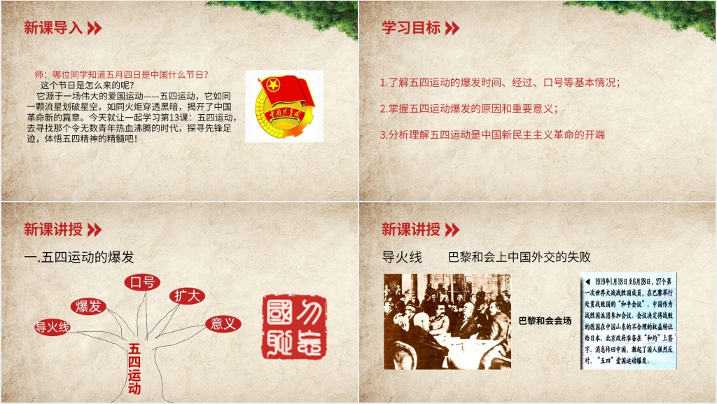 一、五四运动的背景。主要介绍1919年巴黎和会上中国外交的失败,以及中国人民对此的反应和不满。