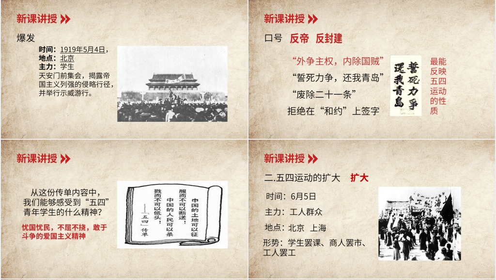 二、五四运动的过程。主要介绍1919年5月4日北京学生的爱国示威,以及全国各地的响应和支持,形成了声势浩大的全国性运动。