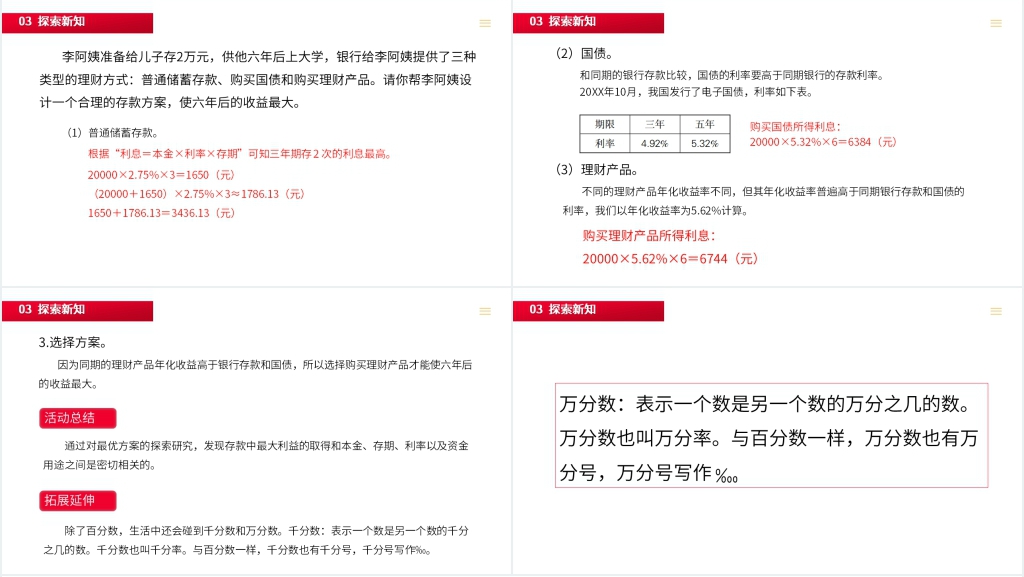 - 展示一些实际生活中经常使用到百分数的例子,如打折、利率、增长率等,以及相应的计算方法。