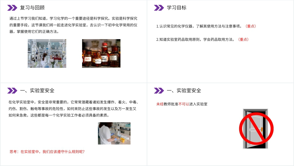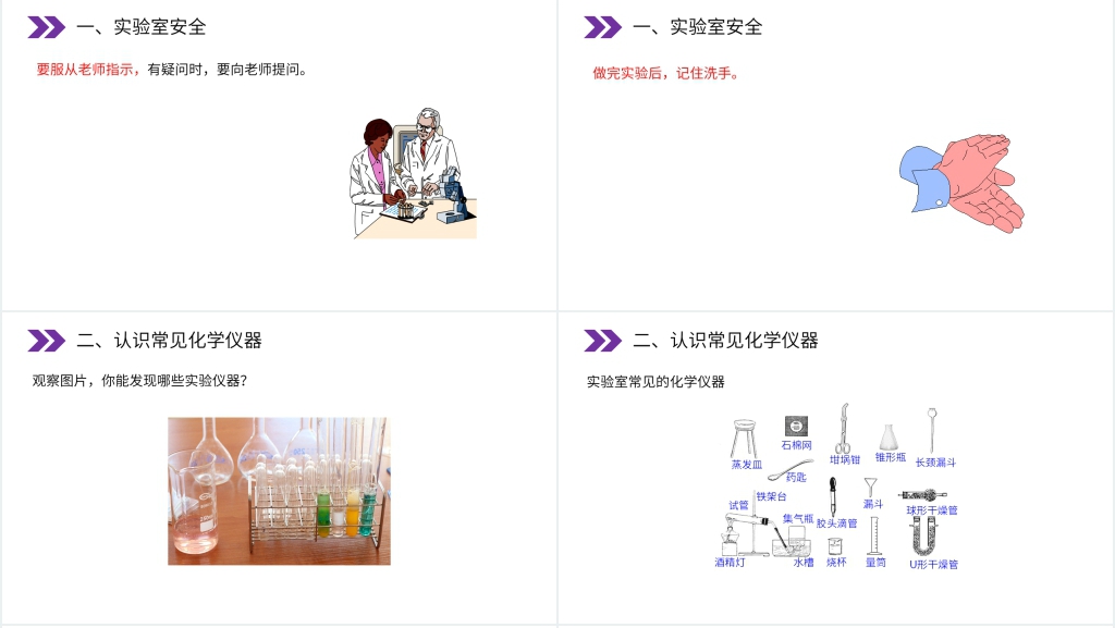 - 首先,我们向学生介绍了化学实验室的基本规则,包括实验室的布局、仪器设备和常用试剂等。