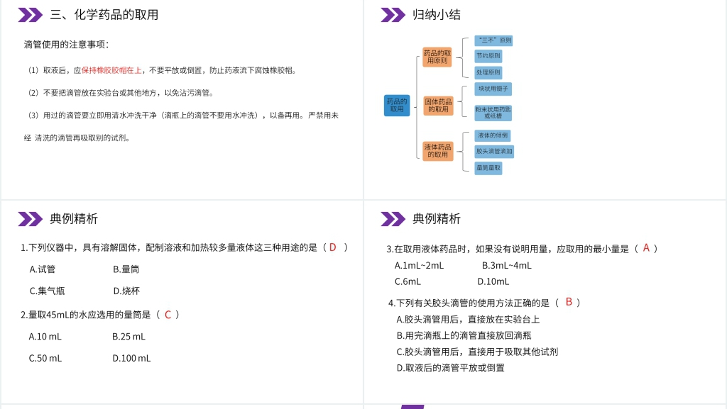 - 我们讲解了化学实验室中常用的实验器材,如烧杯、容量瓶和分液漏斗等,并介绍了它们的用途和使用方法。