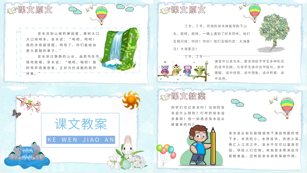 4. 口头表达:要求学生根据课文内容,用自己的话表达对泉水的感受和观察,培养学生的口头表达能力。