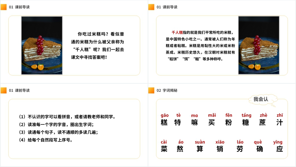 这次课程以经典的千人糕为主题,通过引人入胜的故事情节,展示了中华传统美食的魅力和文化内涵。课文从食材选取、制作过程到历史渊源进行了详细解析,旨在激发学生对传统文化的兴趣和热爱。通过生动的描写和形象的对比,课文展现了千人糕的独特之处和制作技巧,让学生在阅读中感受到传统与创新的结合。通过这个故事,学生们不仅增加了对中国传统文化的了解,还培养了他们的口语表达能力和阅读理解能力。这堂课是一次别开生面的语文课堂,让学生们在轻松愉快的氛围中提高了语文素养。