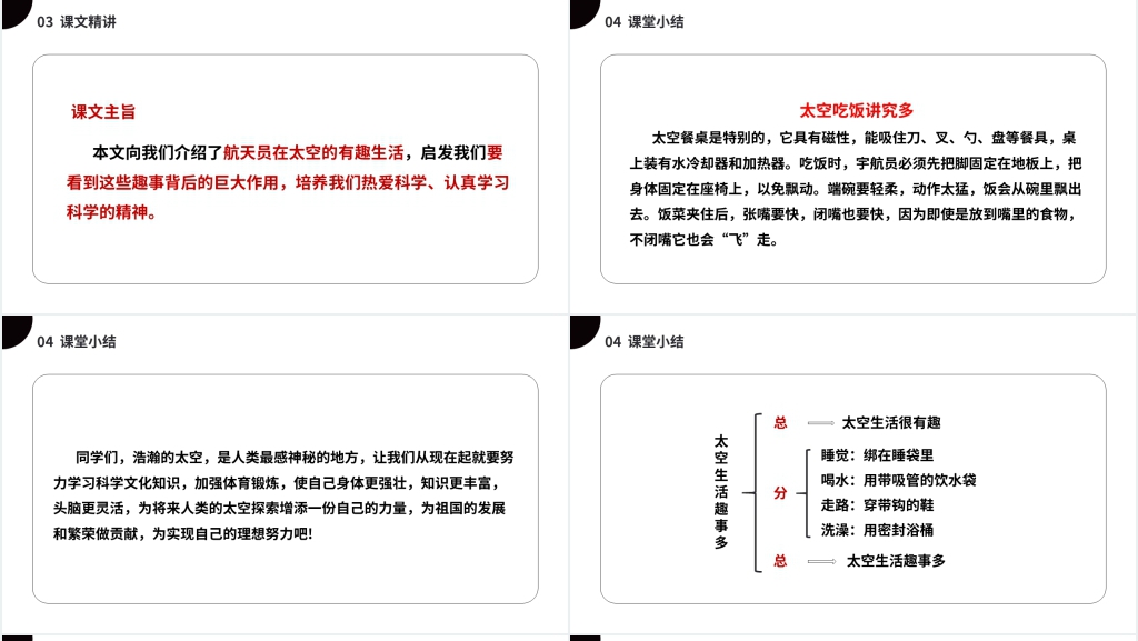 《太空生活趣事多》是小学二年级语文下册的第6.4课时,以下是对这篇课文的教学总结: