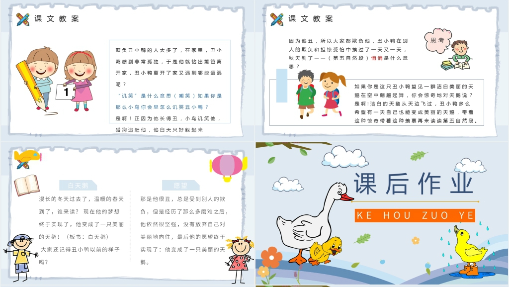 4. 通过课堂讨论和交流,了解学生对《丑小鸭》课文中重点和难点的思考和理解情况。