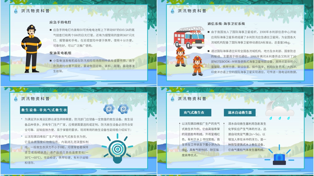 - 洪水来临时的自救和互救方法,以及如何与救援部门配合。