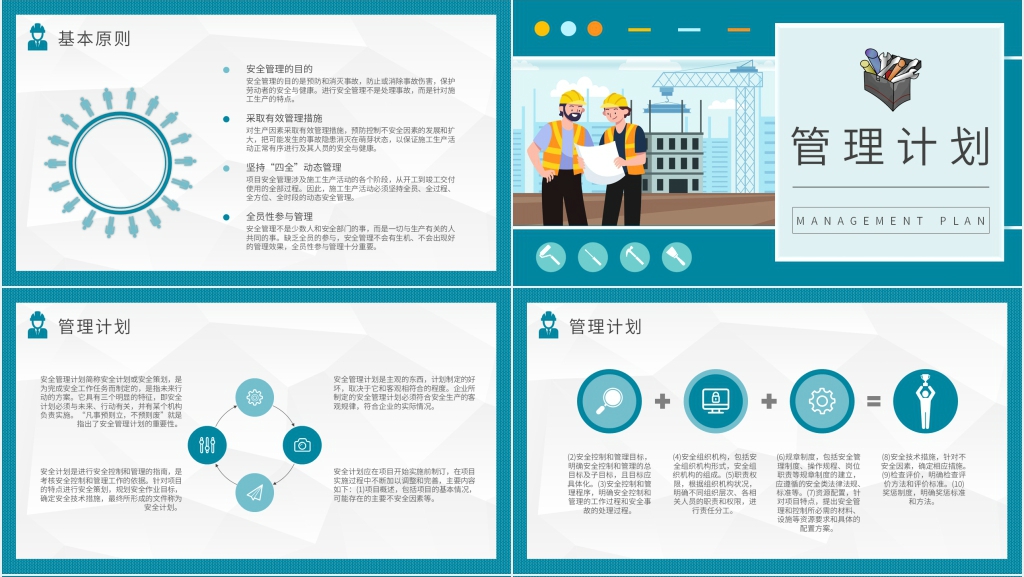 - 工程项目的安全计划和措施,如制定、实施和检查工程项目的安全目标、方案、程序、规范等;