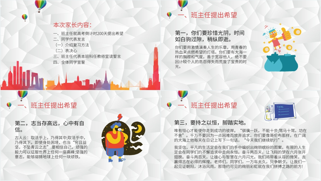 我是您孩子的班主任,今天我想和您们分享一些关于高考的重要信息和建议。高考是我们国家教育体制中最重要的一次考试,它不仅决定了您孩子的升学去向,也影响了他们的未来发展和人生规划。因此,我们作为家长和老师,有责任和义务为他们提供最好的指导和支持,让他们能够以最佳的状态迎接这场决战。
