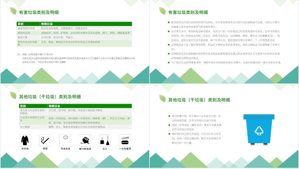 那么,我们应该怎么做呢?首先,我们要了解垃圾的种类和分类标准。一般来说,垃圾可以分为四大类:可回收物、有害垃圾、厨余垃圾和其他垃圾。可回收物包括纸张、塑料、金属、玻璃等,有害垃圾包括电池、药品、油漆等,厨余垃圾包括食物残渣、果皮等,其他垃圾包括纸巾、尿不湿、烟头等。我们要按照这些标准,把不同的垃圾放入不同颜色的垃圾桶中。例如,可回收物放入蓝色的垃圾桶,有害垃圾放入红色的垃圾桶,厨余垃圾放入绿色的垃圾桶,其他垃圾放入黑色的垃圾桶。