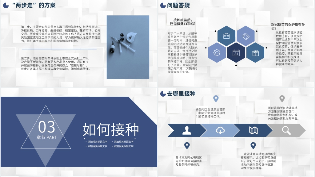 这套简约新冠疫情疫苗科普PPT模板属于内容型,已包含实质内容,可直接使用!