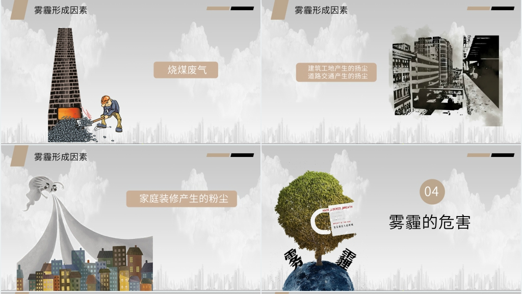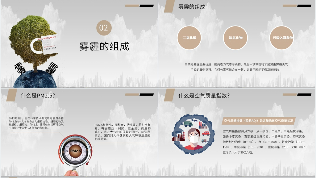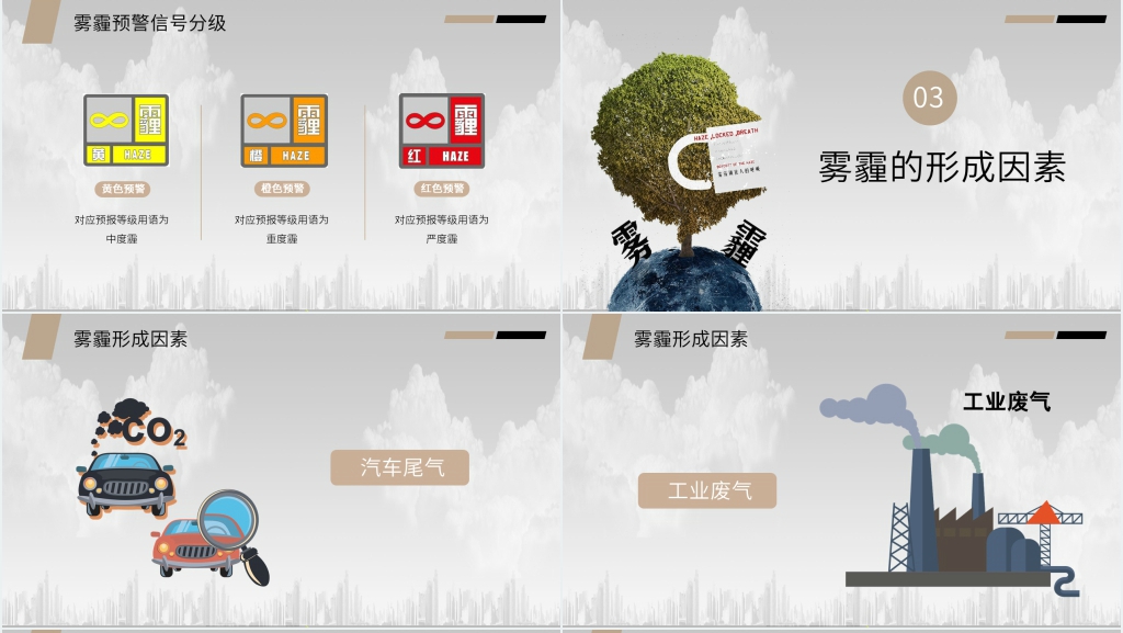 知识普及:介绍雾霾的形成原因,如工业排放、机动车尾气、燃煤等,以及雾霾的成分和对健康的危害。可以提供一些数字和统计数据,以加深学生对问题的认识。