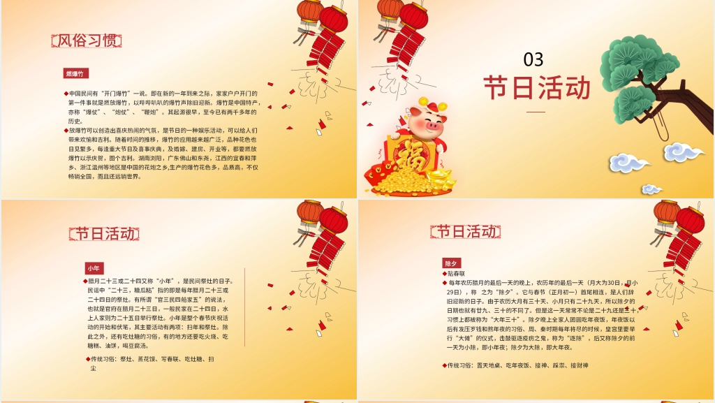 这套中国传统节日春节习俗PPT模板属于内容型,已包含实质内容,可直接使用!