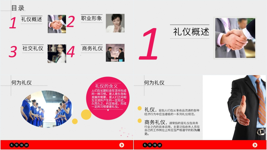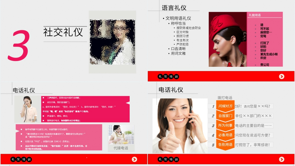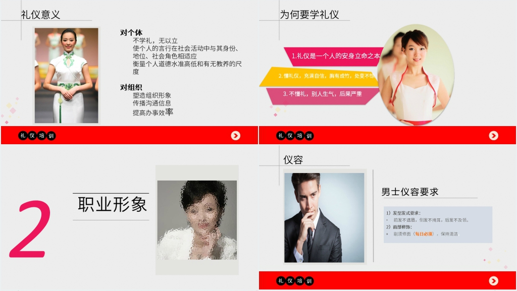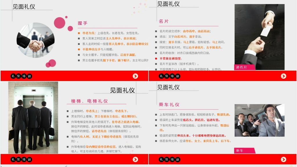 商务礼仪培训是一种专门针对企业员工的培训,旨在提高他们的商务沟通能力和职业形象。商务礼仪培训的内容包括知识形体礼仪、商务场合的着装规范、商务谈判的技巧和礼仪、商务餐桌的礼仪、商务文书的写作规范等。知识形体礼仪是指在商务场合中,如何用正确的姿势、表情、语言和肢体动作来展示自己的专业素养和信任感。知识形体礼仪培训的内容包括如何站立、坐姿、走路、握手、打招呼、自我介绍、倾听、提问、回答、展示等。