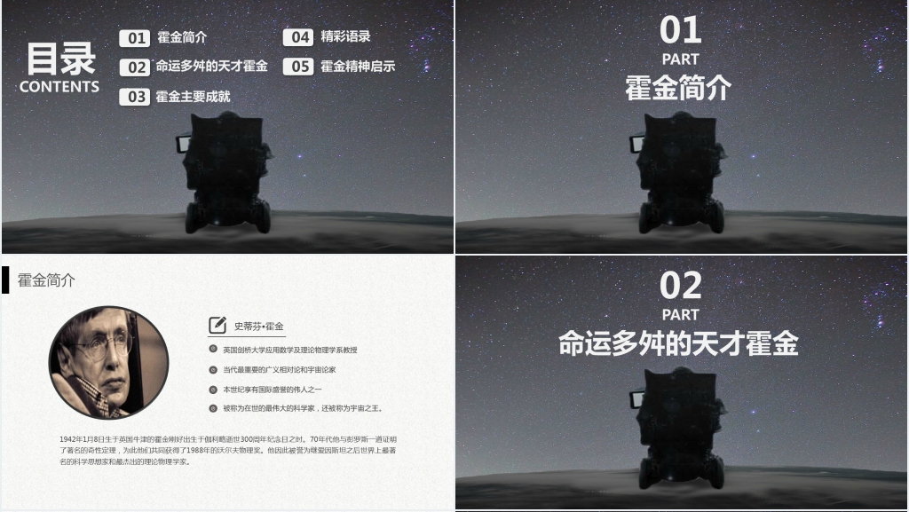 这套霍金的一生介绍PPT模板属于内容型,已包含实质内容,可直接使用!
