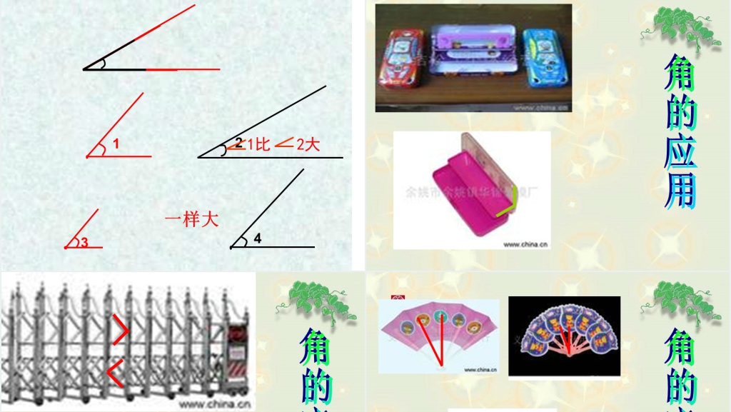 - 介绍不同种类的角,如直角、锐角和钝角,并给出示例进行展示和讨论。
