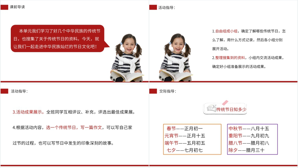 - 分别针对每个节日进行详细的介绍,讲解节日的来历、习俗和庆祝方式。