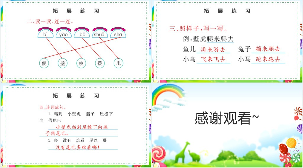 人教版小学一年级语文下册的课程中,有一篇有趣的故事叫《小壁虎借尾巴》。这个故事讲述了小壁虎因为自己的尾巴断了,找了很多动物借尾巴,最后在大家的帮助下,终于找到了合适的尾巴。通过这个故事,孩子们可以学到关于友爱、互相帮助的道理,同时也丰富了他们的想象力和想象空间。