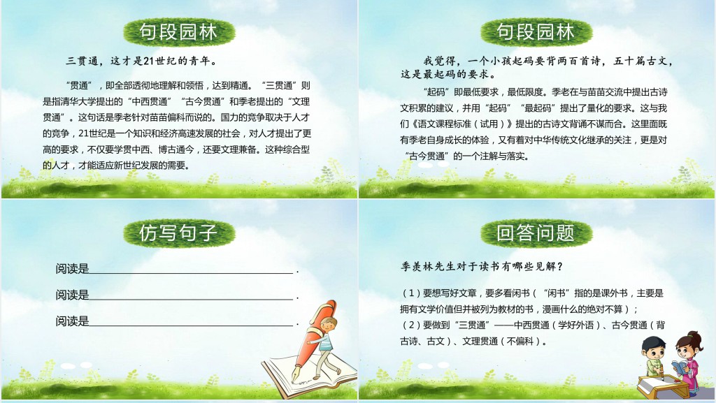 "小学语文小苗与大树的对话"是一段生动有趣的教学内容,通过小苗和大树之间的对话,引导学生了解语文中的一些基本知识,比如字词的组成、句子的构成以及修辞手法等。在这个对话中,小苗代表着学生,而大树则代表着老师或者课本中的知识。通过他们之间的互动,学生可以更好地理解和掌握语文知识,激发对语文学习的兴趣。这样设计的教学内容能够吸引学生的注意力,促进他们的学习效果,提高课堂上的互动性和趣味性。
