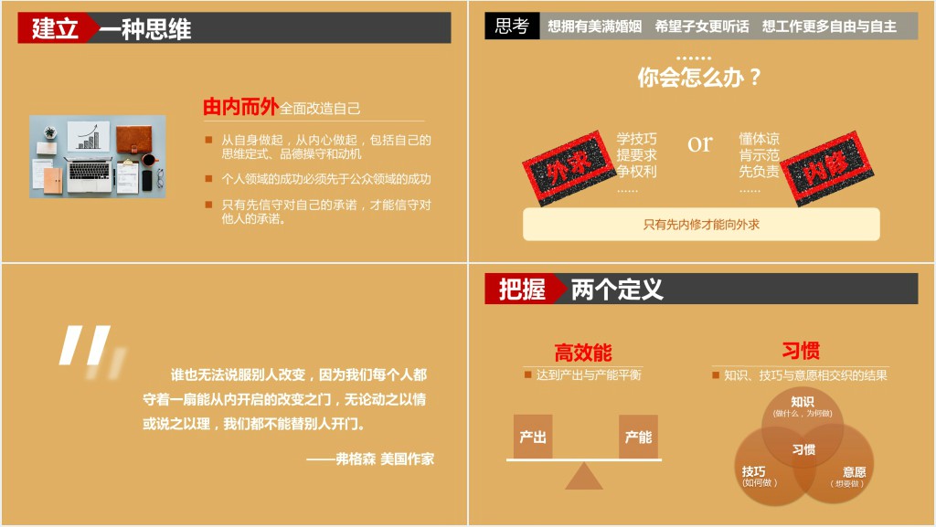 这次分享会的主题是“高效能人士的7个习惯”,通过这次分享会我们将深入探讨高效能人士的成功之道。在这个分享会上,我们将分享关于高效能人士的7个习惯的精华内容,帮助大家更好地理解并运用这些习惯来提升自己的效率和成就。通过这次分享,我们将激发大家的思考,激励大家在工作和生活中追求卓越,成为更加出色的自己。让我们一起探索、学习和分享,共同进步!