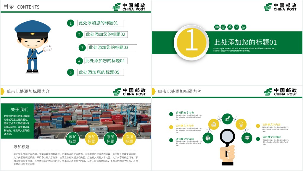 这套中国邮政配送中心PPT模板一共分为28页,适用于邮政快递、物流ems相关内容的呈现展示。