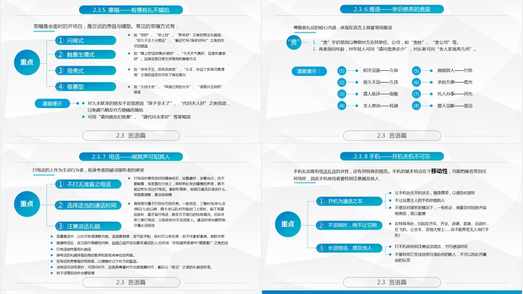 全面商务礼仪常识培训内容丰富多彩,涵盖了商务场合中的着装、言行举止、沟通技巧等方方面面。通过培训可以帮助员工提升专业形象,增强商务交往能力,更好地展现公司的形象和文化。在培训过程中,学员将学习如何在商务社交中保持礼貌及自信,如何与客户建立良好关系,以及如何应对各种商务场合中可能遇到的挑战。这些知识和技巧将有助于提升员工的商务素养,使他们在职场中更加游刃有余。