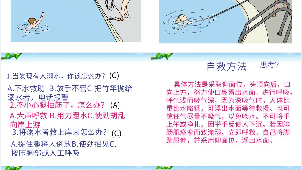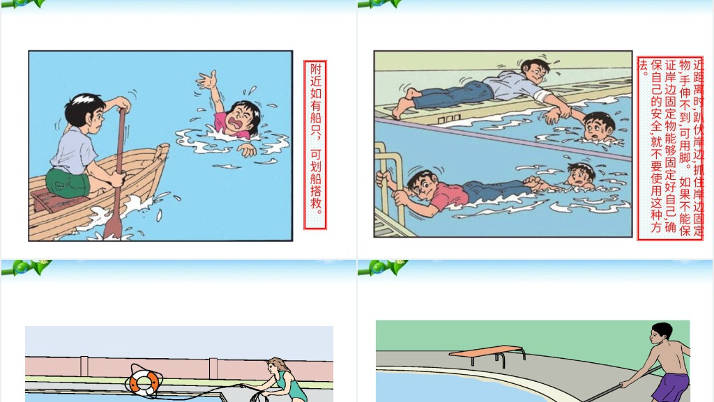 这份防溺水的主题高质量PPT课件内容丰富,采用图文组合方式呈现,适用于溺水安全知识教育、讲解。课堂教学目的:1.全方位促进我院安全知识教育工作中,避免学员溺水事件的产生。2.让学员掌握和把握防溺水和逃生的基本常识,提升逃生自护的工作能力。3.学习培训后,能改变自我在日常生活中不遵循溺水安全的坏习惯,提升对生活中违背安全性标准的行为表现的分辨工作能力。课堂教学关键:学习培训溺水安全的基础知识,塑造预防工作能力。